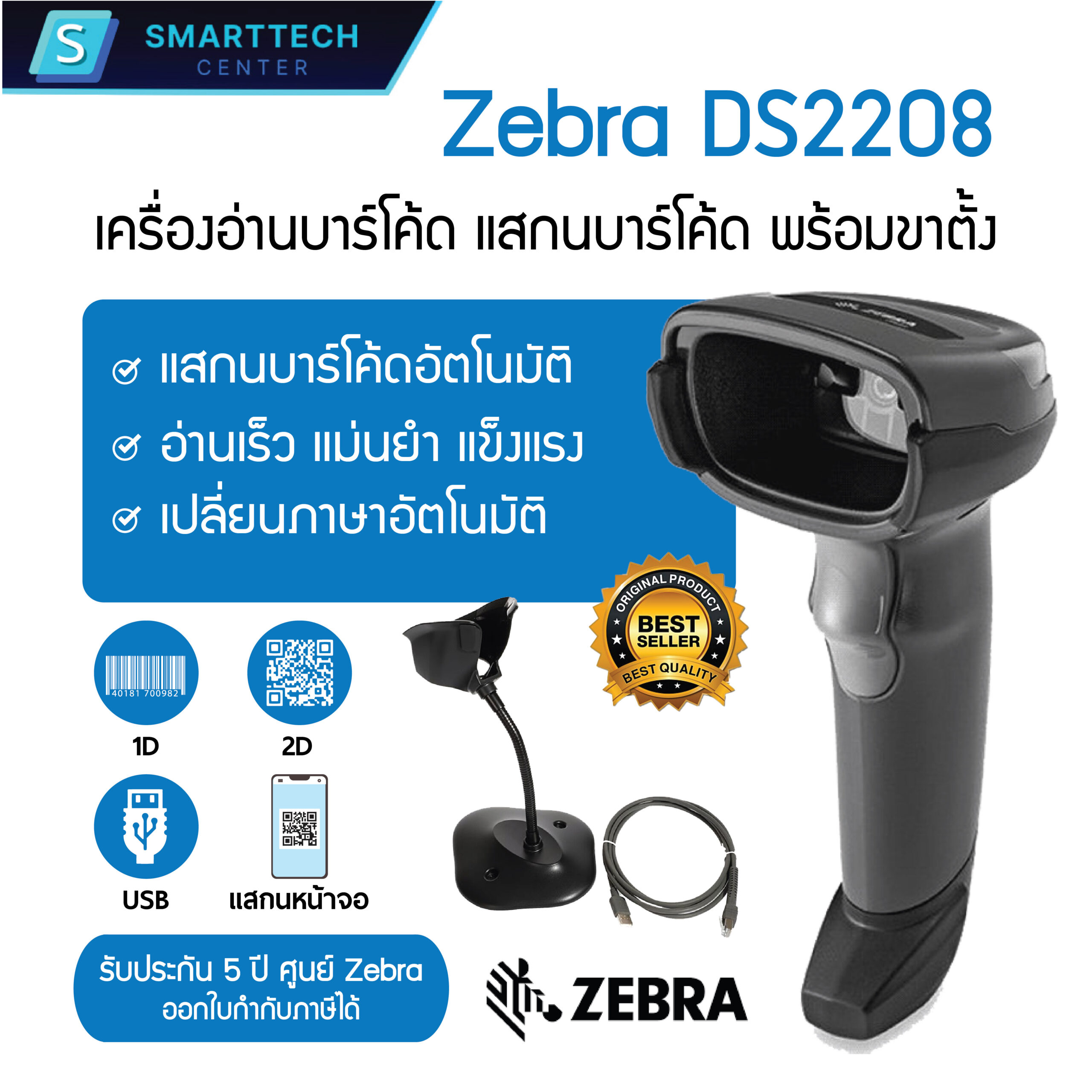 Zebra รุ่น DS2208 เครื่องอ่านบาร์โค้ด แสกนบาร์โค้ด แบบ 1D , 2D , QR Code พร้อมขาตั้ง ของแท้ 100 % รับประกัน 5 ปี ศูนย์ Zebra